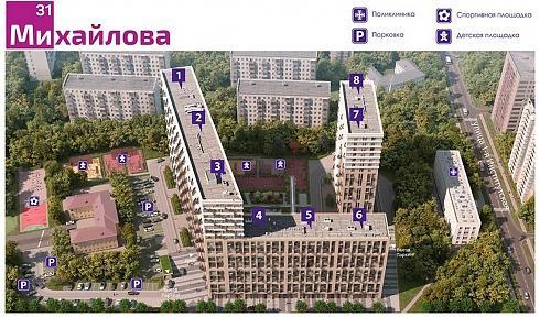 Расположение ЖК «Михайлова, 31», находящегося не в самом благополучном, с точки зрения экологии, месте ЮВАО, на деле оказывается не таким уж и страшным. Улица Михайлова идет параллельно Рязанскому проспекту и находится по другую сторону от промзоны Грайвороново, которая постепенно исчезает с карты Москвы. В соседях у комплекса окажутся как минимум два новых ЖК – «Среда» и «Кварталы 21/19». Сам же ЖК будет ближним соседом Кусковскому лесопарку и дальним родственником станции метро «Рязанский проспект», расстояние до которой от комплекса составляет около полутора километров. Строительство, начавшееся в IV квартале 2016 года, завершилось выдачей ключей в IV квартале 2019. «Михайлова, 31» состоит из 8 секций, создающих полузакрытый двор, секции с четвертой по шестую 12-этажные, остальные имеют по 19 этажей.
