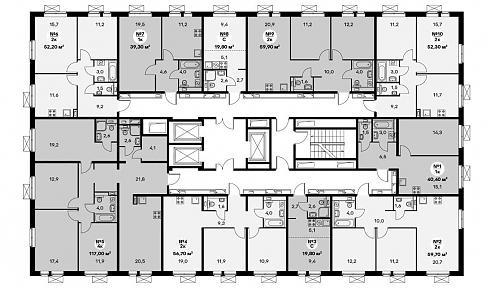Секция №2: 210 квартир, 41 кладовая площадью от 2,8 до 7,7 кв. м, 6 коммерческих помещений.
