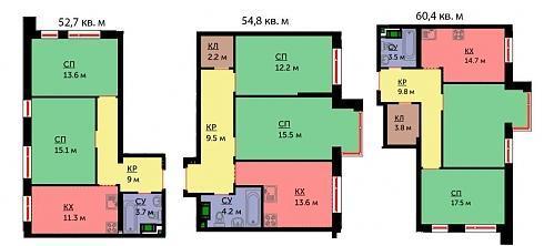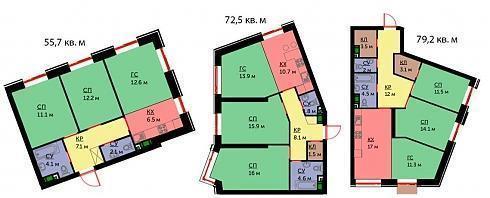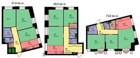 Окон в трехкомнатных квартирах предостаточно, однако, в диапазоне 61-74 кв. м покупателю предлагаются только евро-планировки.