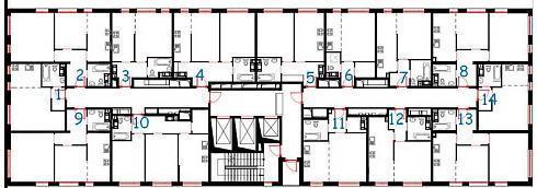 Два грузопассажирских и один обычный лифт будут тут трудиться не покладая стальных канатов, ибо проектировщики КРОСТа решили разместить на лестничных клетках по 14 апартаментов: