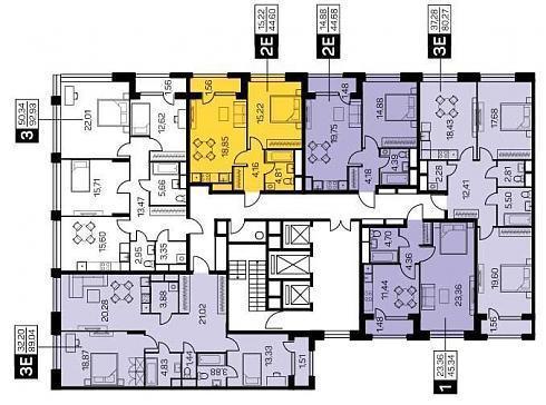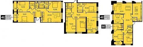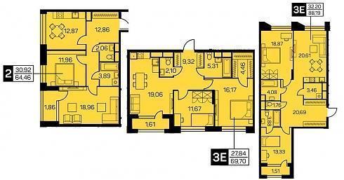 Двухкомнатные. Выбирая такую квартиру на «шахматке», Вы, естественно, будете ориентироваться на цифру «2». Открыв планировку, Вы увидите обозначение «3Е». Это не ново – если в квартире кухня способна выполнять функции гостиной или столовой, маркетологи немедленно относят это к «евро-планировкам». Сути дела в данном случае это не меняет – большая кухня найдется в любой здешней «двушке», будь в ней 65, 70 или 89 кв. м.