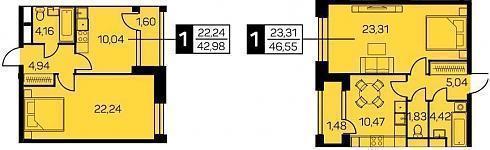 Однокомнатные. Схожие планировочные решения отличаются лишь конфигурацией санузлов, они могут быть как совмещенными, так и раздельными: