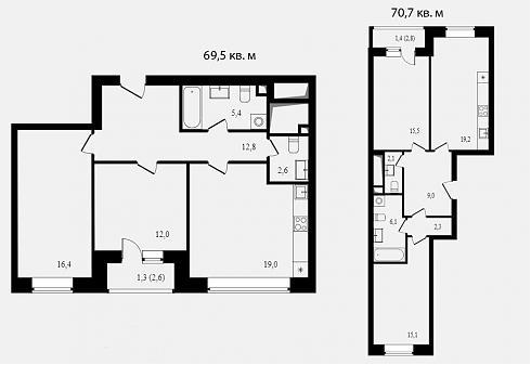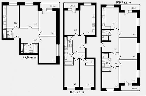 Трехкомнатные квартиры представлены в двух вариантах распашной планировки, наибольшее количество метров можно найти в четырехкомнатных квартирах ЖК: