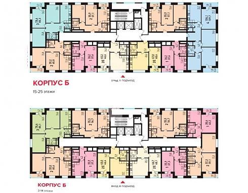 к.Б – 25 этажей, 219 квартир, первые два этажа занимает частный детский сад на 65 мест.