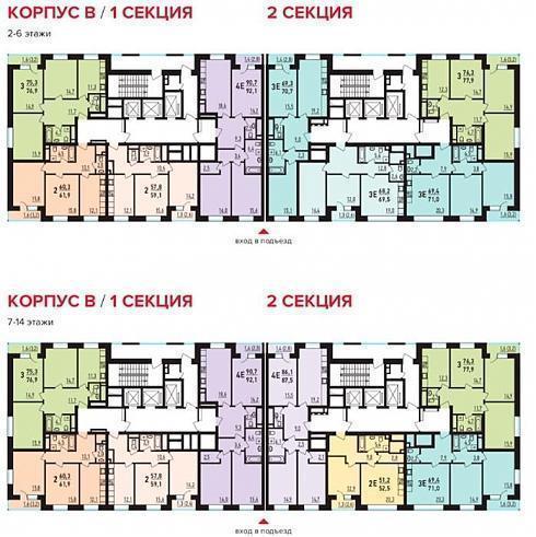 к.В – 2 секции по 14 этажей, 104 квартиры, 5 нежилых помещений.