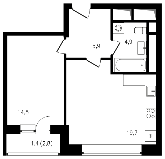 Похожая схема реализована и в двухкомнатных квартирах комплекса – до 60 квадратов это классика,