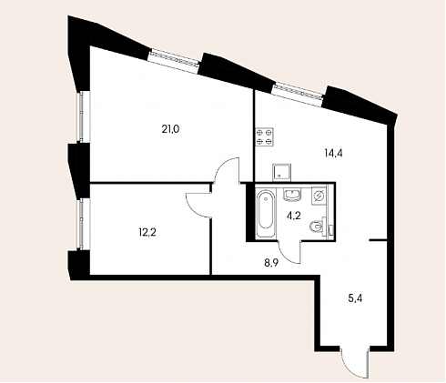 В четырех двушках из шести у Вас будет как минимум одна трапециевидная комната. В двух вариациях планировок, отличающихся только площадью трехкомнатных апартаментов, таких комнат окажется уже три, причем две из них будут смежными.