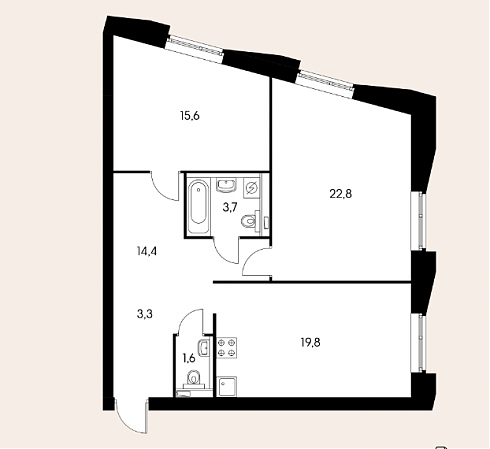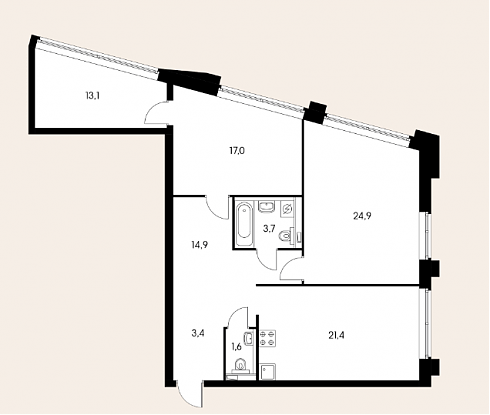 А вот выбранная форма трапеции определенным образом отразилась на планировках апартаментов и, возможно, не все они покажутся однозначно удачными.