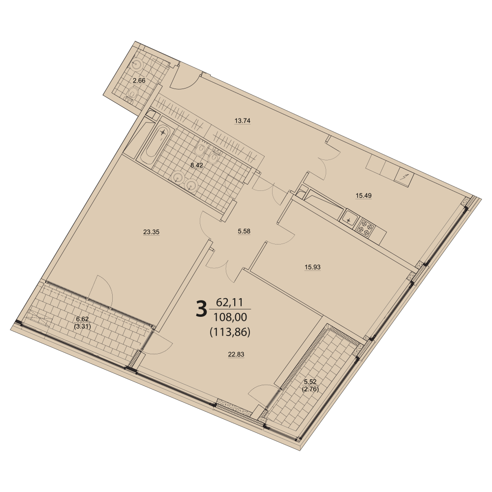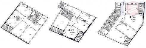 В трехкомнатных квартирах дома изредка попадаются параллельные друг другу стены, но в основном бал здесь правит занимательная геометрия: