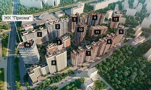 ЖК «Призма» находится в 300 метрах от Ленинского проспекта, но именно с этой магистралью комплекс ассоциируется в умах большинства потенциальных покупателей (не вполне понятно, чем им не угодила улица Обручева). Комплекс состоит из одного корпуса весьма оригинальной геометрической формы, что отчасти объясняет мотивацию компании «Флэт и Ко», выведшей его на рынок как отдельный проект вне строящегося здесь же Квартала 38А.