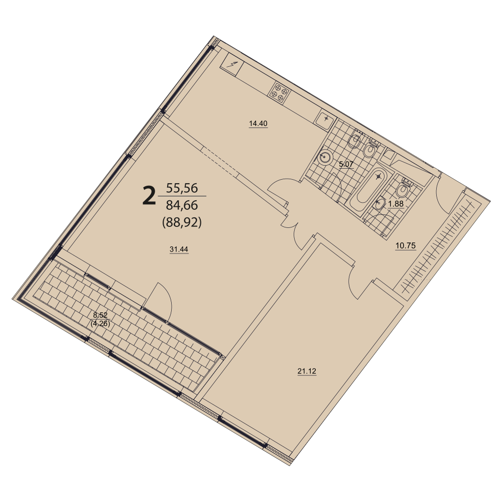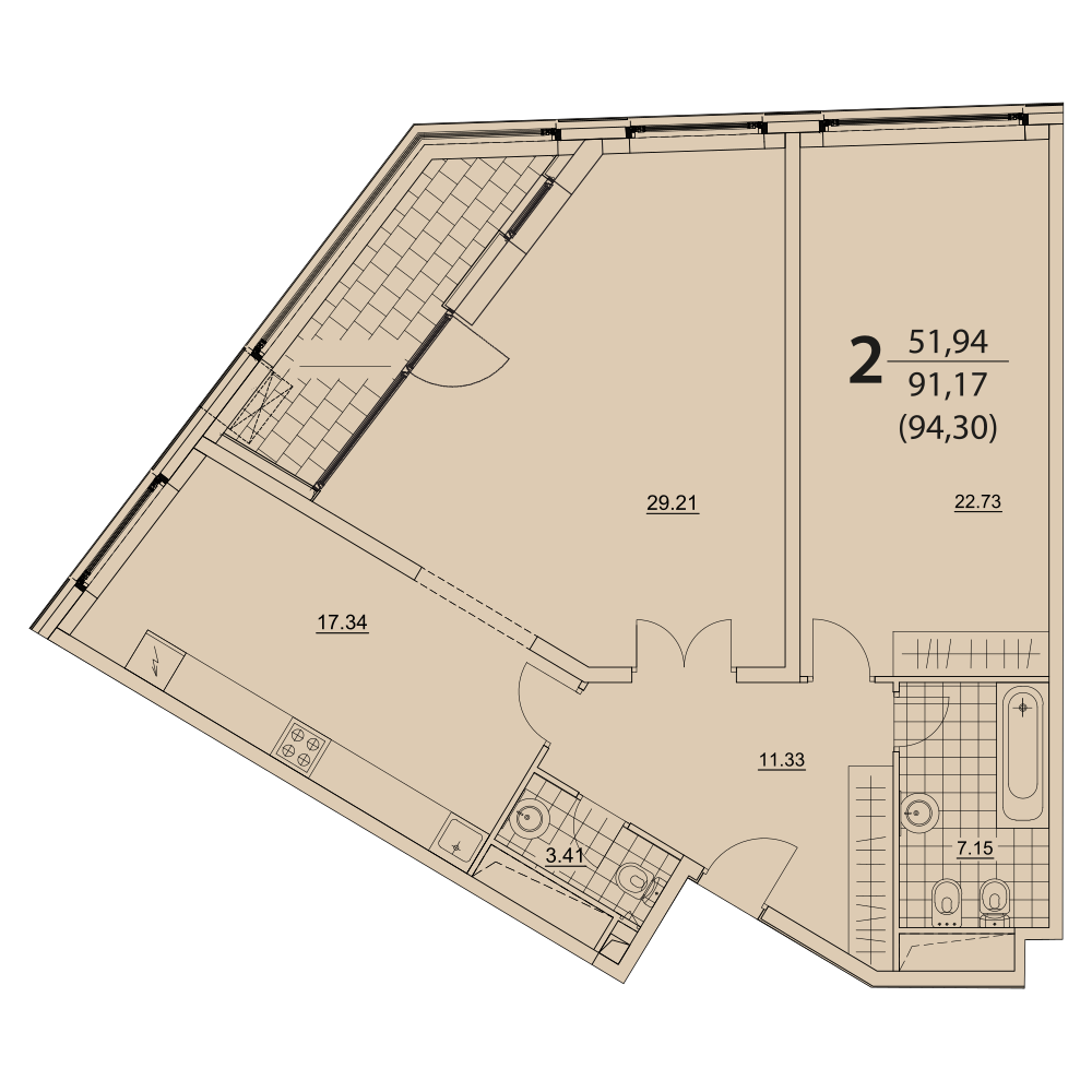 Однокомнатных квартир в «Призме» нет, помимо отряда «верхних» двушек», на других этажах встречаются два типа двухкомнатных квартир и один евро-вариант:
