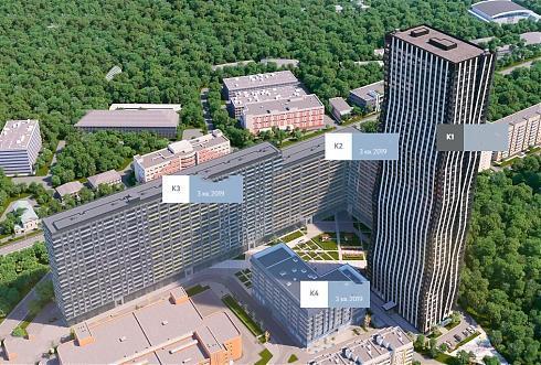 К жилой части относятся три корпуса из четырех. К первой очереди строительства относятся 16-этажный корпус №2, 20-этажный корпус №3 и 7-этажный корпус апартаментов №4, разрешение на ввод по ним было получено 17.09.2019.