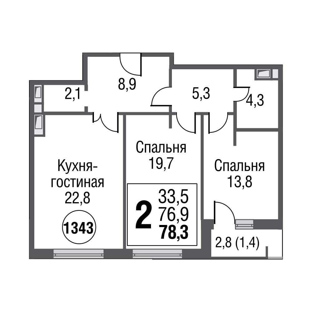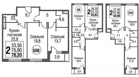 Двухкомнатные. Здесь возможны два варианта планировки, линейная и распашная. Метраж «линеек» ограничен в отличие от «распашонок», площадь которых уходит далеко за отметку 80 кв. м, что, учитывая площадь кухни, дает им возможность называться евро-трешками: