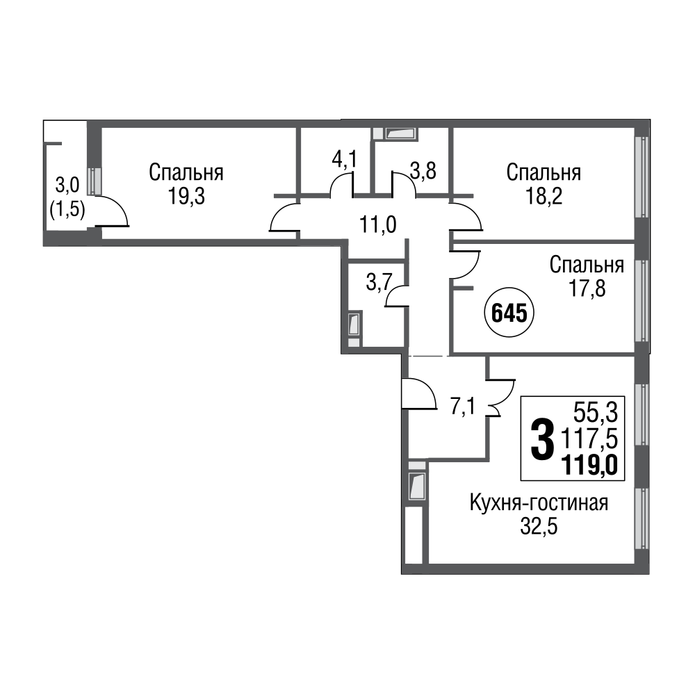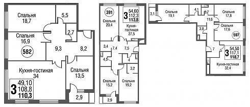 Трехкомнатные. Шикарно – по-другому и не скажешь. Четырехкомнатные. На таких уровнях несколько метров разницы в минимально и максимально возможных метражах становятся несущественным, но угловое расположение дарит самую большую из возможных кухню гостиную: