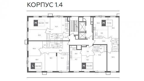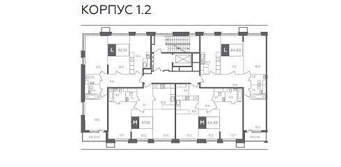 Наименьшее количество квартир, по четыре, расположено на этажах корпусов 1.2 и 1.4: