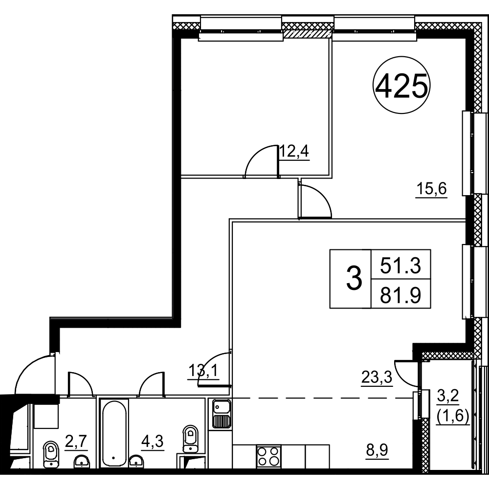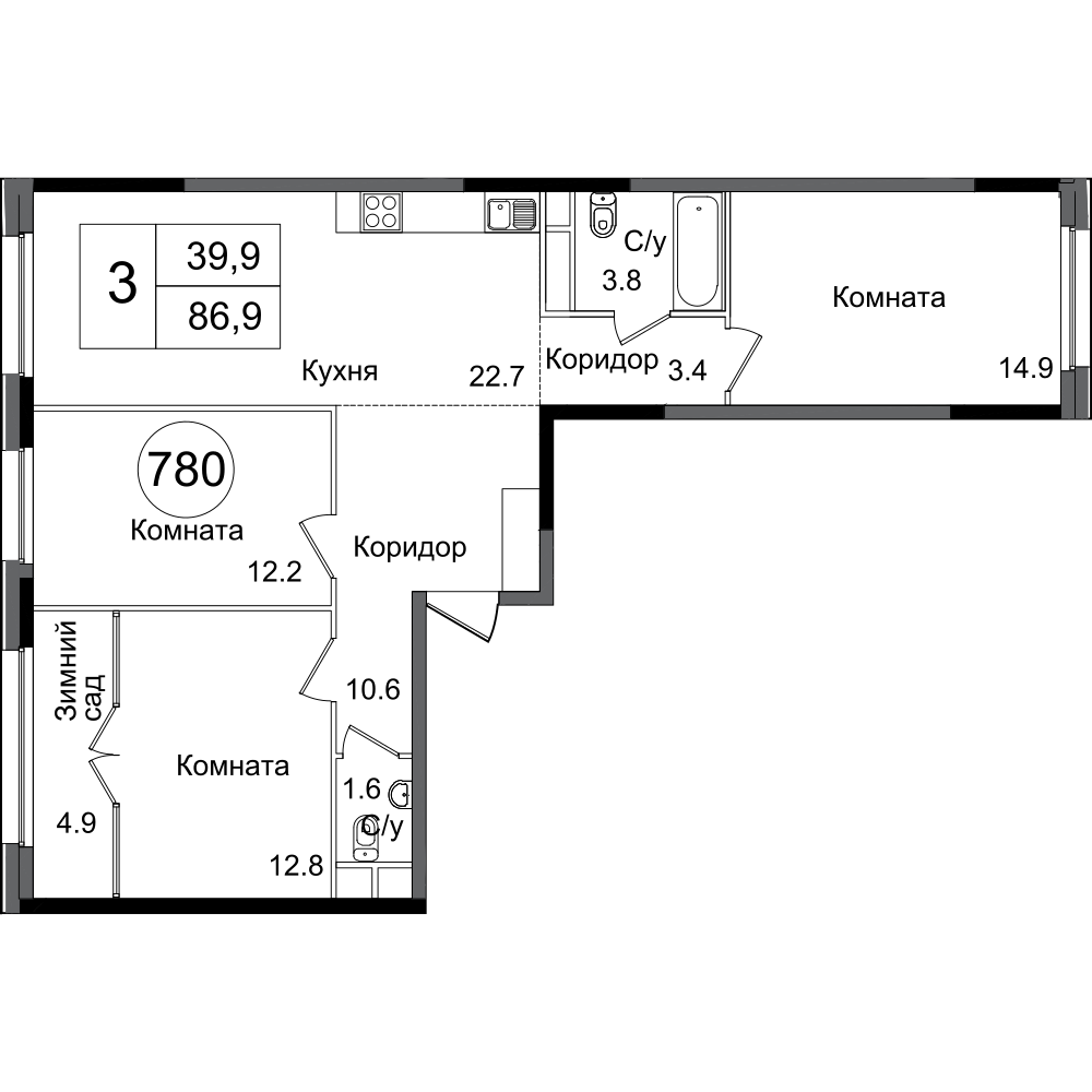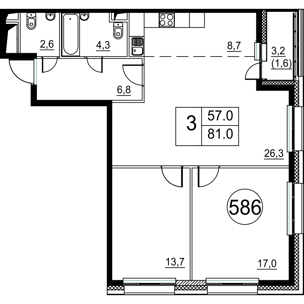 Трехкомнатные квартиры отличаются только ориентацией относительно сторон света, разница в метражах, практически, отсутствует: