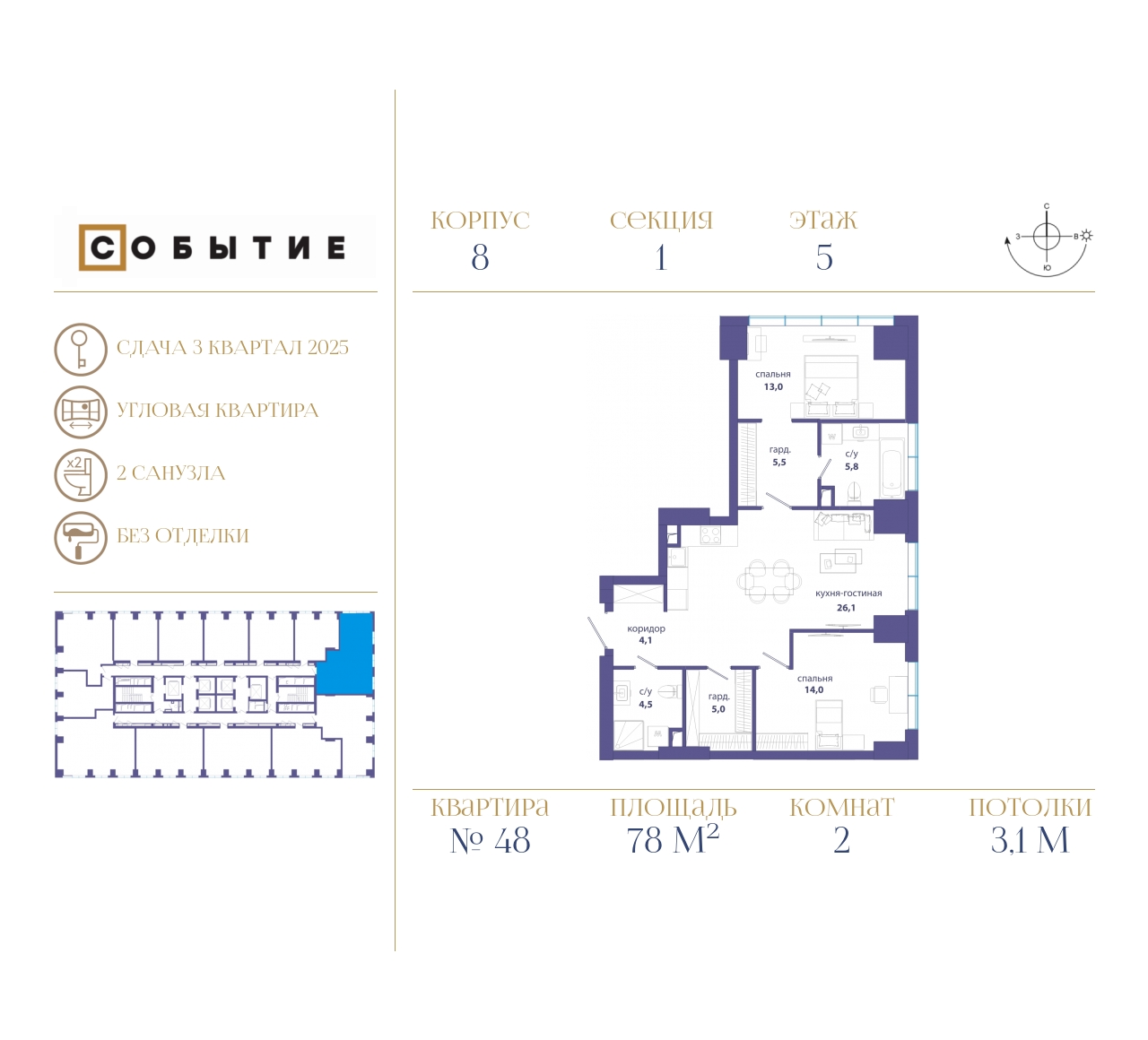 к. 2: 50 этажей, 1 секция, 531 квартира - РВЭ ожидается в III квартале 2025 года.