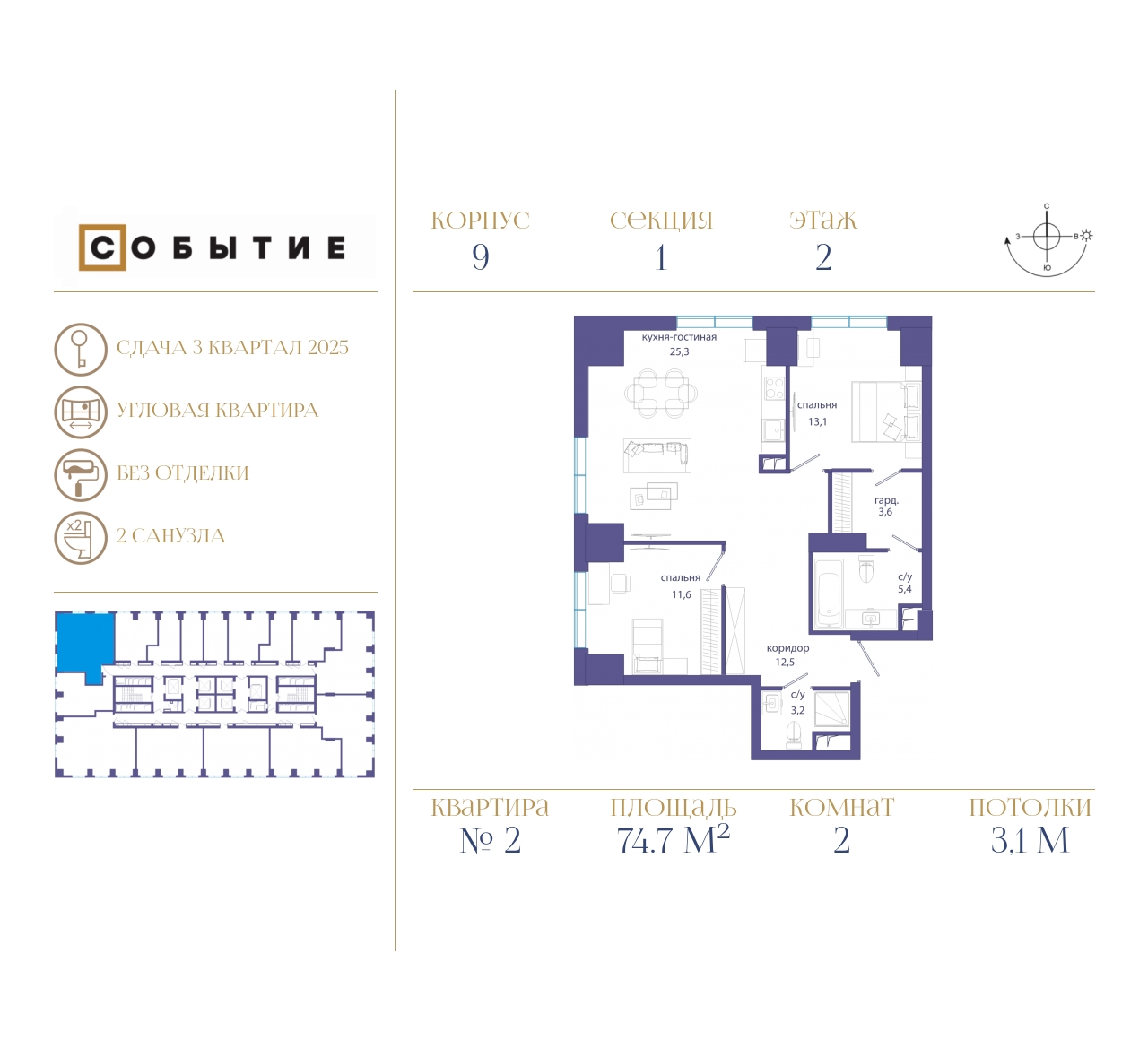 2-комнатная квартира  74.7 м2