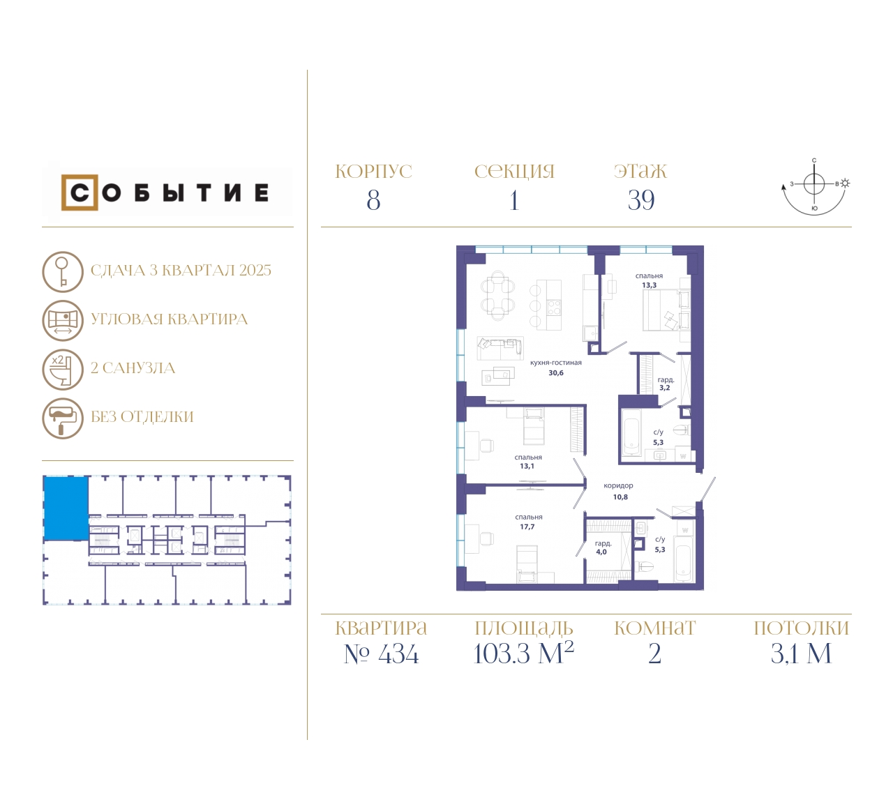 3-комнатная квартира  103.3 м2