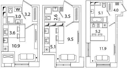 Самые небольшие 26-метровые студии в домах первой очереди строительства представлены в корпусе Т5, в корпусе Т2 их метраж подбирается к 30 кв.м, в корпусе Т4 превышает этот показатель: