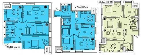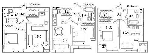 В корпусах М2, М4, М5 и М7 представлена пара вариантов распашных планировок, при этом разница в площадях квартир будет внушительной: