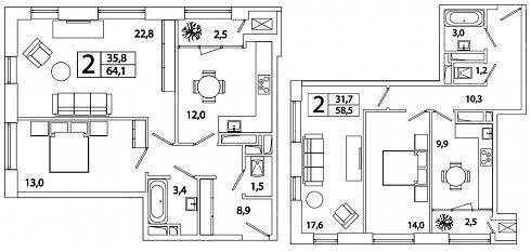 Самым популярным предложением в корпусах Т4 и Т5 являются линейные двухкомнатные квартиры площадью 64 кв. м. В дополнение к этому, в корпусе Т5 большое распространение получили 58-метровые угловые «двушки»: