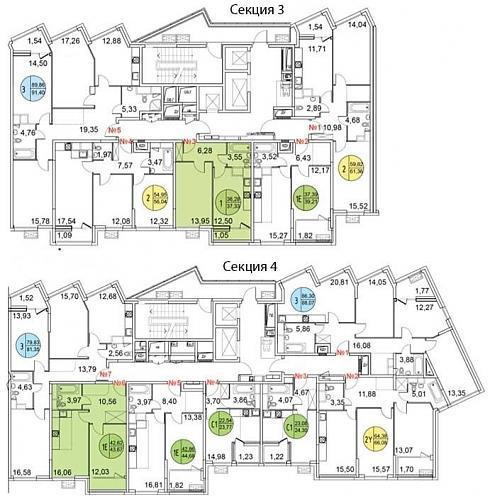 4 секция: 19 этажей, первый этаж нежилой, 2-19 этажи – 7 квартир и 2 лифта.