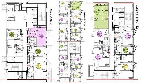5 секция: 12 этажей, первый этаж – 4 квартиры, 2-6 этажи – 13 квартир, 7-12 этажи – 6 квартир и 3 лифта.