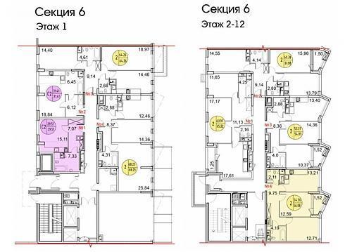6 секция: 18 этажей, первый этаж – 4 квартиры, 2-18 этажи – 4 квартиры и 2 лифта.