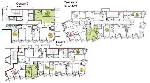 7 секция: 21 этаж, первый этаж – 3 квартиры, 2 этаж – 6 квартир, 3-21 этажи – 7 квартир и 2 лифта.