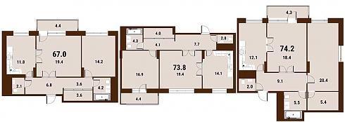 | Январь 2020 | 67,1-75,1 м2 | 24 774 796 - 27 475 560 ₽ | ~367 960 ₽ | 1.99% |