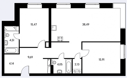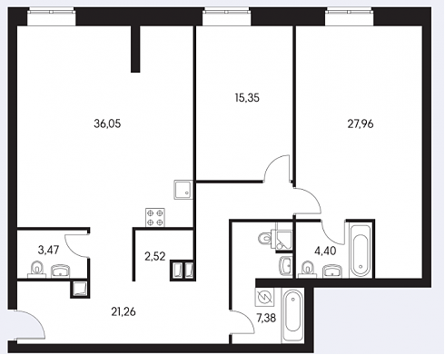 Самая большая трехкомнатная квартира обладает площадью под 150 кв. м.