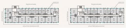 Помещения сдаются без межкомнатных стен, не выложены даже мокрые зоны, их границы намечены трассировкой по полу, ни балконов, ни лоджий здесь нет. Выбор апартаментов немного затруднен ввиду того, что на схеме не видно ни количество, ни принцип расположения окон. Известно лишь то, что окна будут панорамными и начнутся на высоте 60 см от пола. Определяться предстоит, попеременно заглядывая во вкладки "Планировки и цены" или "Подобрать по параметрам", держа при этом под рукой презентационный буклет.