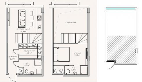 В самых больших "пентхаусах", помимо двух спален и дополнительной ванной комнаты на втором уровне будет выход на отдельную небольшую террасу.