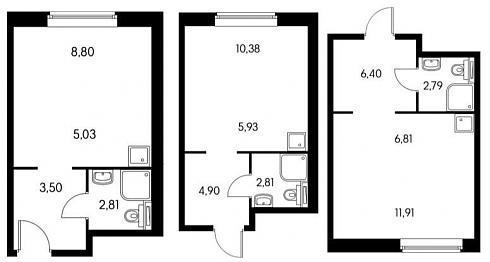 Площадь студий находится в диапазоне 20,14-27,91 кв. м: