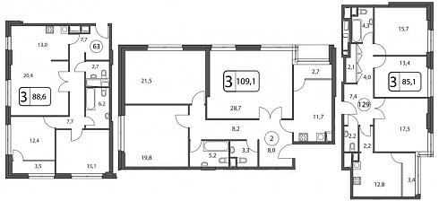 Трехкомнатные. Здесь будущему собственнику предлагаются два типа планировочных решений, а метражи и количество окон предоставляют пространство для любого маневра: