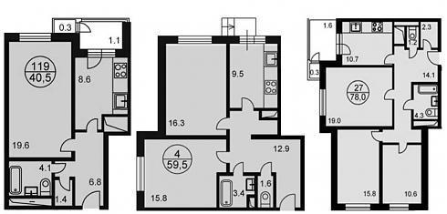 Данные корпуса не только имеют внешнее сходство и одинаковый конструктив – планировки квартир в них также абсолютно идентичны. Метражи однокомнатных квартир находятся в районе 40 кв. м, двухкомнатных – 60 и трехкомнатных – 80 кв. м: