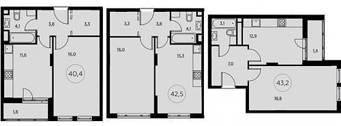 Однокомнатные. Почти квадратная форма квартир площадью от 40,4 до 42,7 кв. м позволила рационально спланировать их жизненное пространство – при скромной прихожей нашлось место для гардеробной комнаты, размер кухни может варьироваться от 11,6 до 15,3 кв. м. В 43-метровой «однушке» особое внимание уделено жилой комнате, а санузел выглядит совсем скромно: