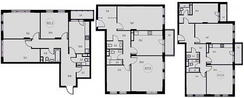 то квартиры площадью выше 80 кв. м, равно как и единственный вариант планировки шести на оба корпуса четырехкомнатных квартир, никаких вопросов по части площади и функционала не вызывают:
