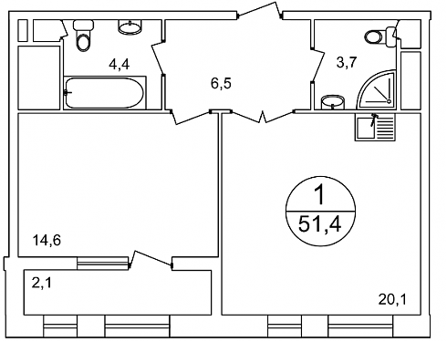 В промежуточном, 50-метровом варианте однокомнатной квартиры Вы получите большой гостевой санузел и 20-метровую кухню-гостиную: