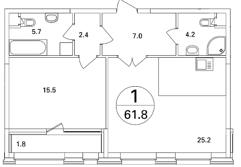 Все то же самое, только еще больших размеров, окажется в однокомнатной квартире площадью 61,8 кв. м: