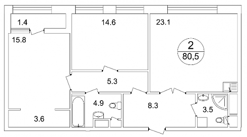 Распашная двухкомнатная квартира площадью 73,4 кв. м покажется идеальной: