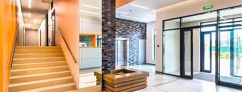 Корпуса в Комплексе, как и говорилось выше, монолитные, их наружные стены выполнены из «легкого бетона», вентилируемые фасады отделаны фиброцементными панелями, клинкерной плиткой и компакт-ламинатом.