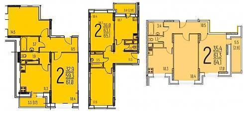 | Январь 2019 | 63,1-66,9 м2 | 3 522 600 - 4 027 300 ₽ | ~58 526 ₽ | |