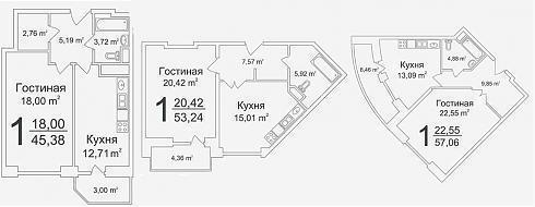Однокомнатные. Планировки в прямых секциях ожидаемо оказались такими же правильными, в центральных и торцевых секциях к ним добавились нестандартные решения. Площадь квартир во всех случаях будет очень приличной: