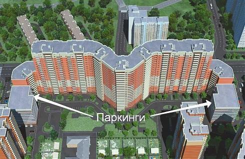 Неизвестно, что помешало Застройщику организовать при доме, претендующем на статус клубного, нормальную подземную парковку – возможно, проблемы с переносом коммуникаций, что частенько бывает в густонаселенных городах, возможно, что-то еще. По крайней мере, в первой проектной декларации упоминался двухуровневый подземный паркинг на 164 автомобиля. Тем не менее, вопрос, пусть и нестандартным методом, был решен: по углам здания появились два автоматизированных 12-этажных паркинга, рассчитанных на 298 машиномест каждый: