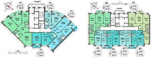 В первых трех секциях расположено 316 квартир, из них 210 однокомнатных, 22 двухкомнатных и 84 трехкомнатных. В секциях с четвертой по девятую расположено 568 квартир, из них 273 однокомнатные, 171 двухкомнатная и 124 трехкомнатных квартир. На стандартной лестничной клетке расположено от четырех до шести квартир, обслуживаемых тремя лифтами, два из которых будут грузопассажирскими: