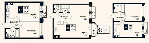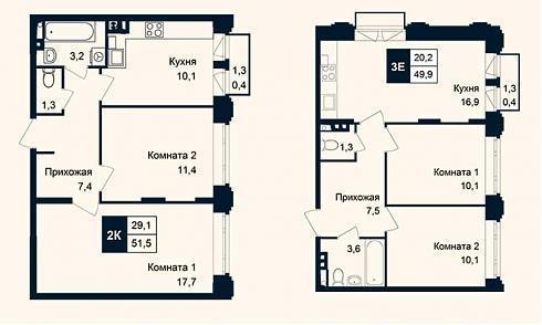 Двухкомнатные квартиры могут иметь классическую планировку или увеличенную за счет жилых комнат «евро-кухню»:
