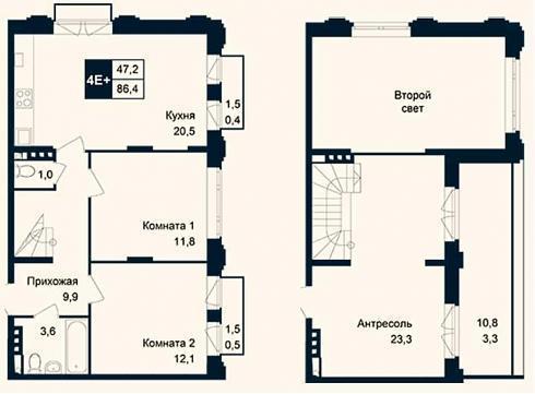 Совсем мудреные обозначения количества комнат употребляются на официальном сайте ЖК «Бартон» в описании двухуровневых квартир, расположенных на последних этажах его корпусов. Здесь присутствуют экзотические квартиры «3Е+», «3К+»
