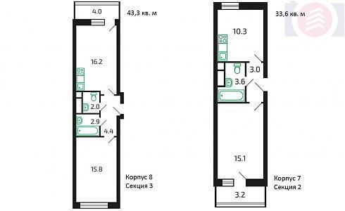 Однокомнатные квартиры корпуса №8 имеют существенные различия и по метражу, и по планировочным решениям: